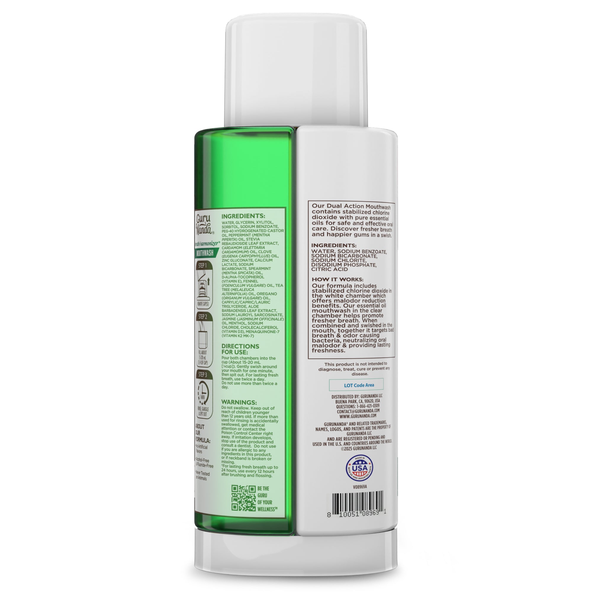 FRAÎCHEUR DOUBLE ACTION : Le bain de bouche GuruNanda Breath Harmonizer Oral Rinse présente une formule à double chambre sans fluorure combinant du chlorite de sodium et des huiles essentielles qui aident à éliminer les odeurs désagréables, offrant 24 heures d'haleine fraîche lorsqu'il est utilisé deux fois par jour.